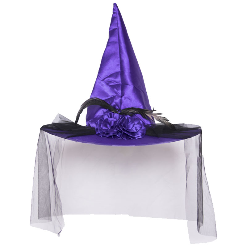 Sombrero de Bruja con Tul Rosas y Plumas Violeta cantidad