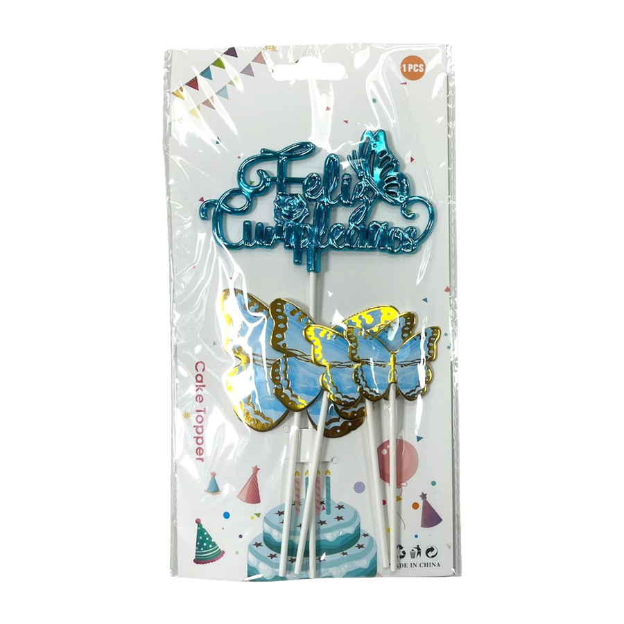 Topper Feliz Cumpleaños Cursiva 3D Mariposas Celestes 5pcs