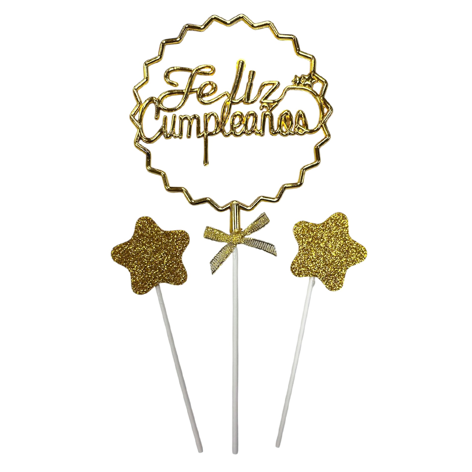 Topper Feliz Cumpleaños Cursiva Metal 3D Dorado Con Estrellas 3pcs