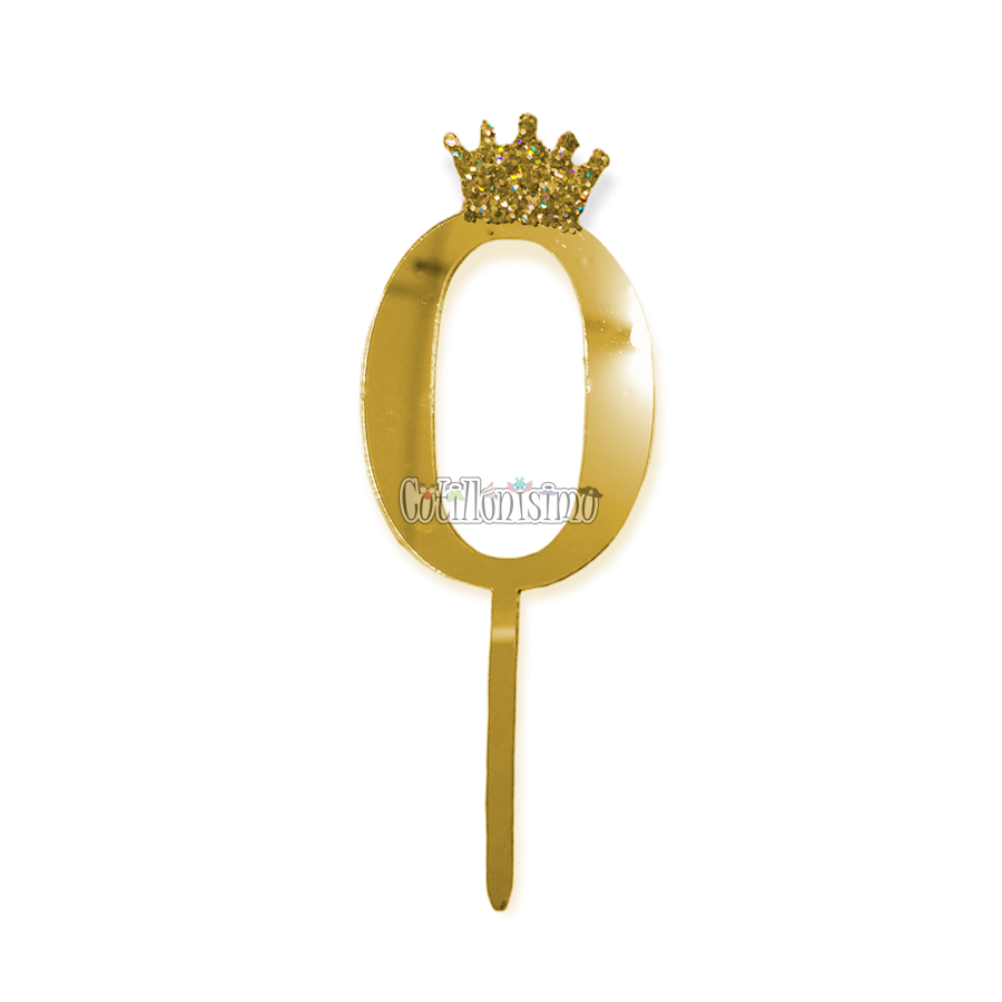 Topper para Torta Dorado «Nº0» Con Corona 11cm Material: Acrílico Efecto Espejado Color Dorado