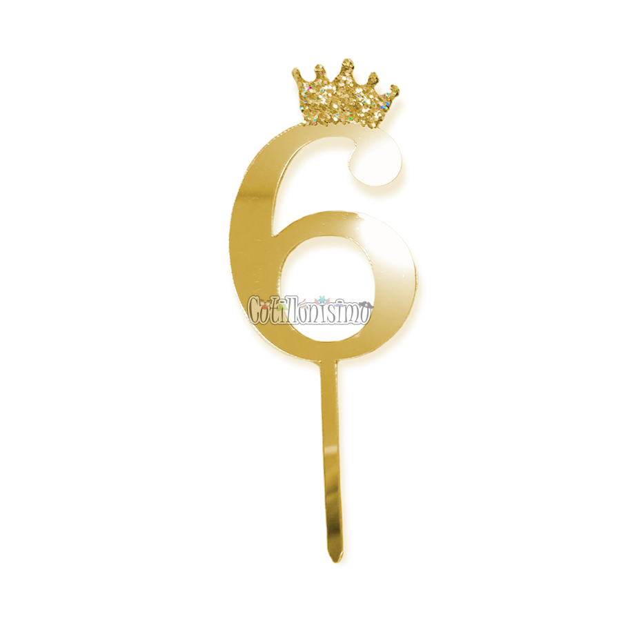 Topper para Torta Dorado “Nº6” Con Corona 11cm Material: Acrílico Efecto Espejado Color Dorado