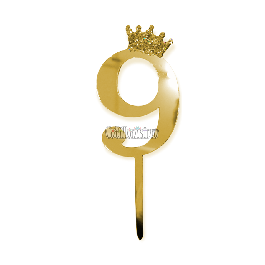 Topper para Torta Dorado «Nº9» Con Corona 11cm Material: Acrílico Efecto Espejado Color Dorado