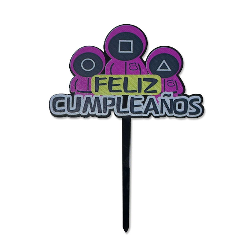 Topper Pinche para Torta Feliz Cumpleaños – Tematico Juego del Calamar Material: Acrílico Medidas aproximadas: 114 cm x 7 cm