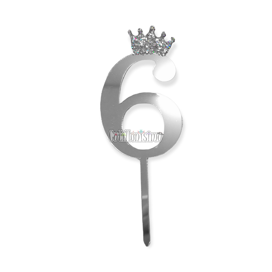 Topper para Torta Plateado Nº6 Con Corona 11cm cantidad