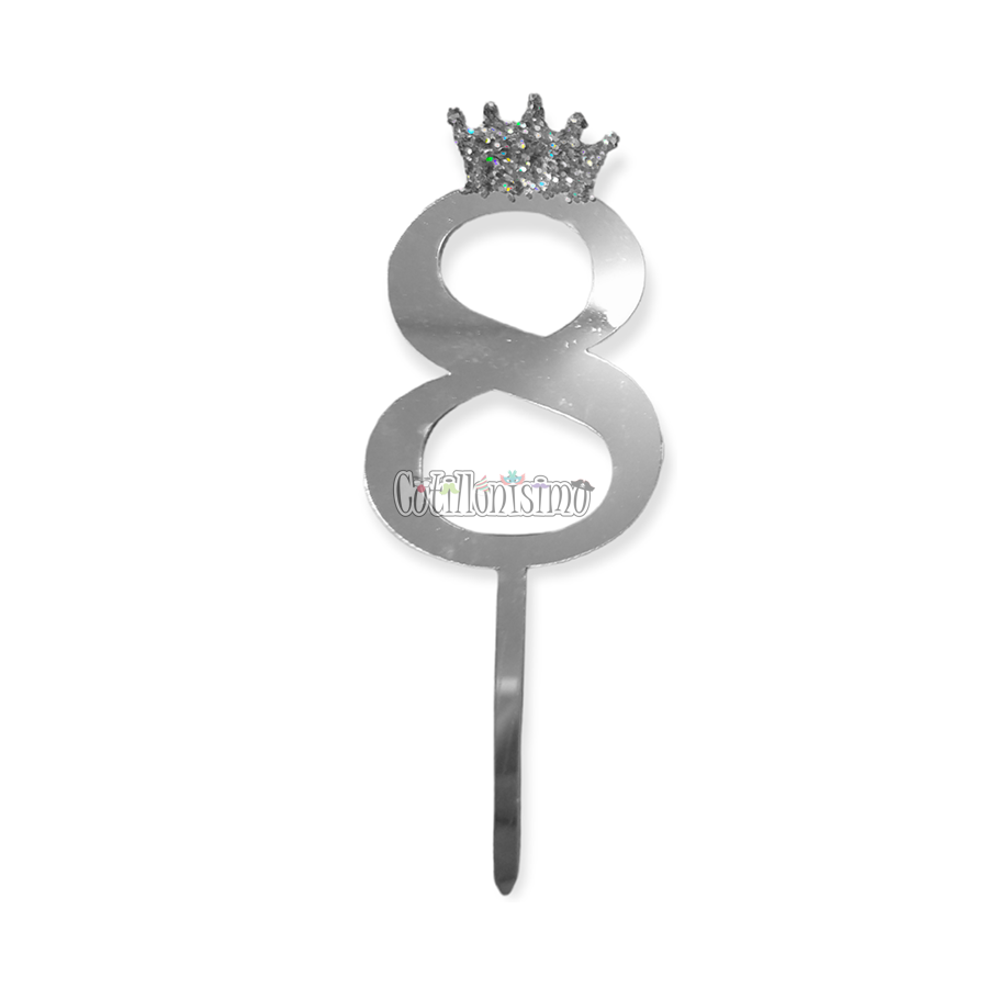 Topper para Torta Plateado Nº8 Con Corona 11cm cantidad