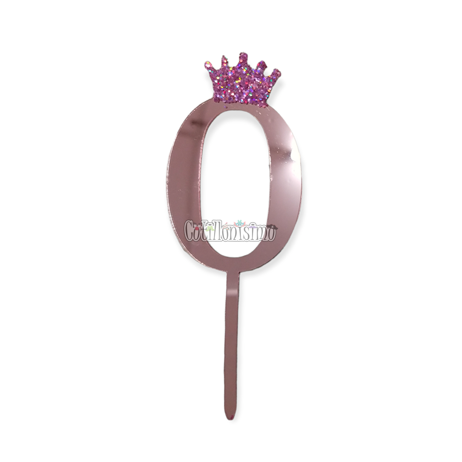 Topper para Torta Rosa Gold «Nº0» Con Corona 11cm Material: Acrílico Efecto Espejado Color Rosa Gold