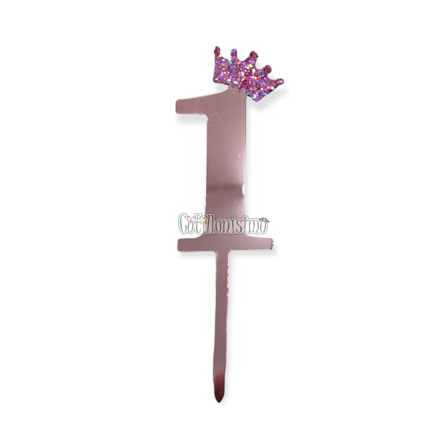 Topper para Torta Rosa Gold «Nº1» Con Corona 11cm Material: Acrílico Efecto Espejado Color Rosa Gold