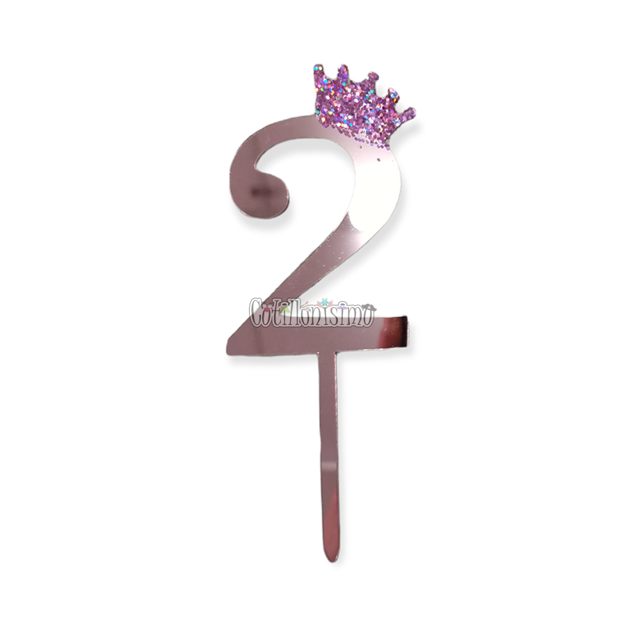 Topper para Torta Rosa Gold «Nº2» Con Corona 11cm Material: Acrílico Efecto Espejado Color Rosa Gold