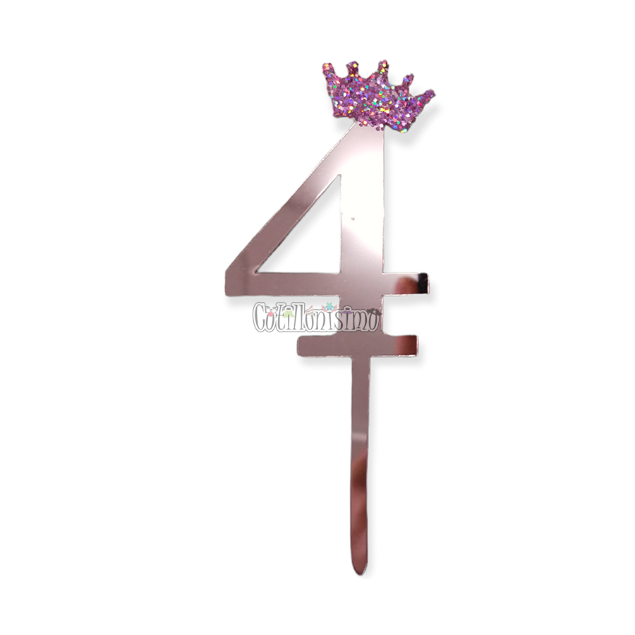 Topper para Torta Rosa Gold «Nº4» Con Corona 11cm Material: Acrílico Efecto Espejado Color Rosa Gold