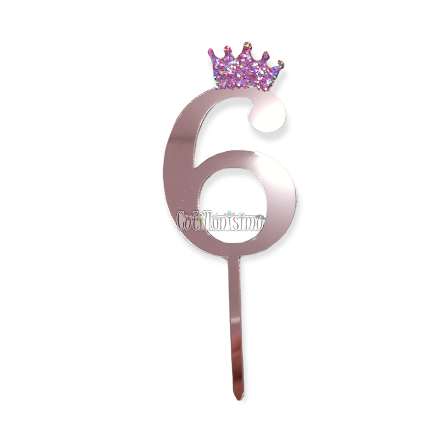 Topper para Torta Rosa Gold «Nº6» Con Corona 11cm Material: Acrílico Efecto Espejado Color Rosa Gold