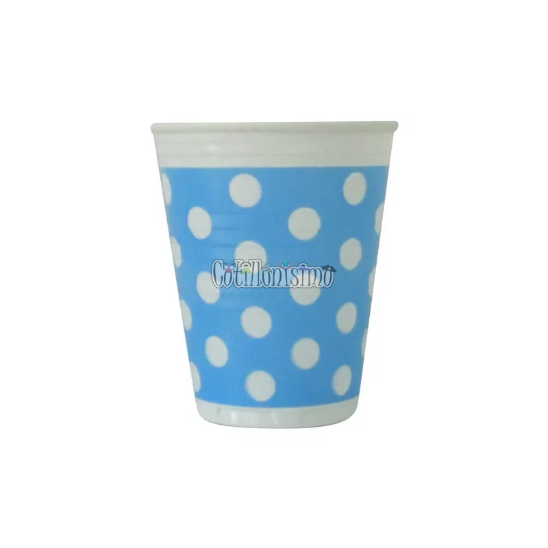 Vaso Plástico Blanco con Lunares Celeste Descartable 180cc x100u Medida aproximada: 8 cm de alto x 7 cm de circunferencia