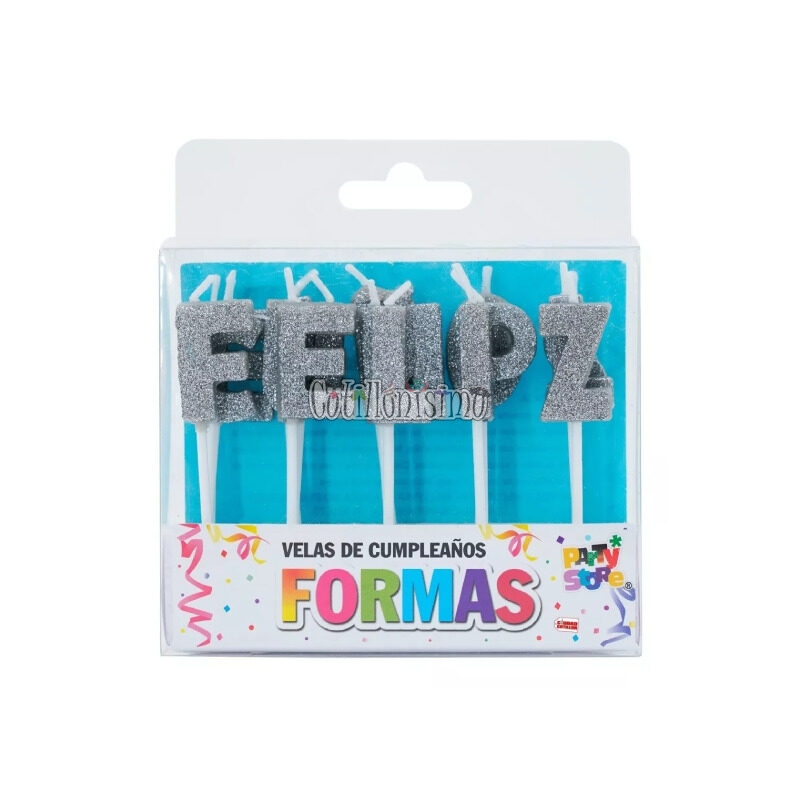 Velas Formas Set Frase “FELIZ CUMPLEAÑOS” Plateado Contiene 15 velas