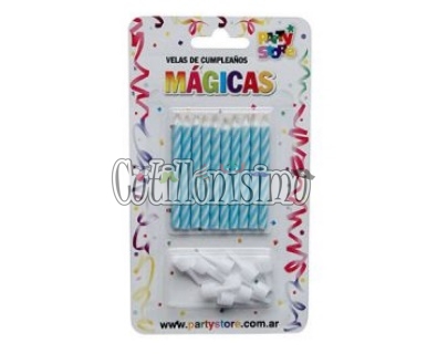 Vela Torneada Magica Celeste X10 Unidades con 10 Bases (Se vuelven a encender) Incluye 10 Bases Porta Vela