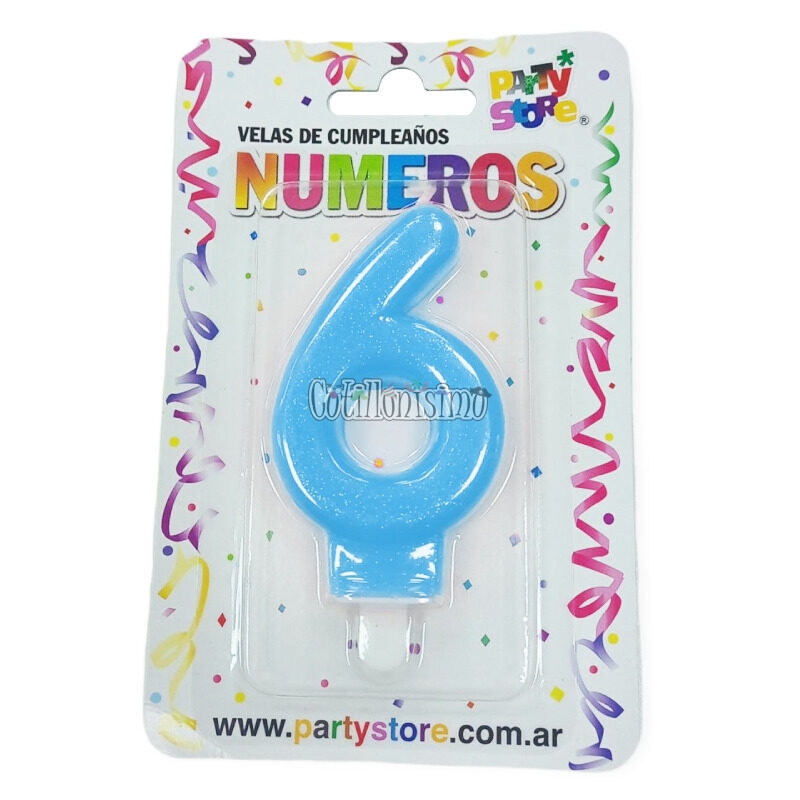 Vela Numero Celeste Brillos N° 6 Con Base Medida total aproximada: 9cm
