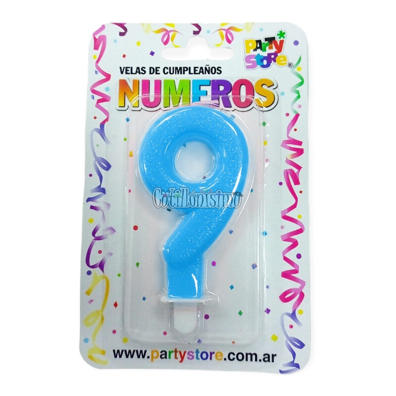 Vela Numero Celeste Brillos N° 9 Con Base Medida total aproximada: 9cm