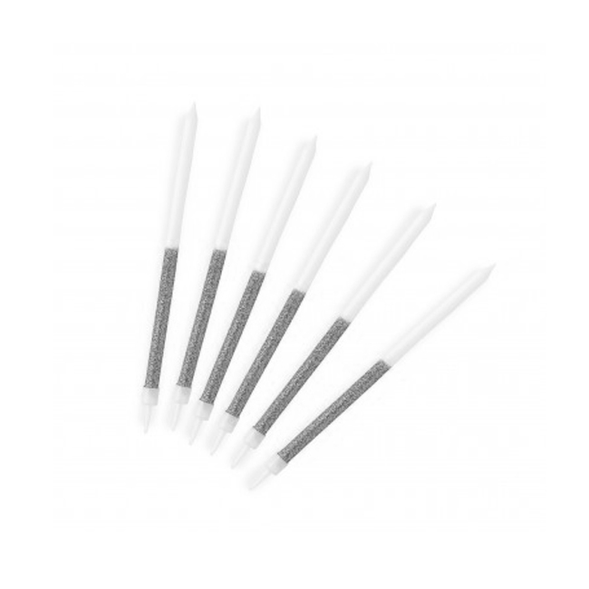 Vela Palito con Porta vela Gibreadas 12cm x6u Plata y Blanco Bicolor