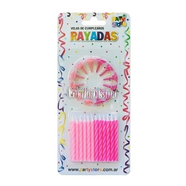 Vela Rayada Torneada Colores Nena Rosa Magenta Fucsia X24u con 12 Bases Incluye 12 Bases Porta Vela