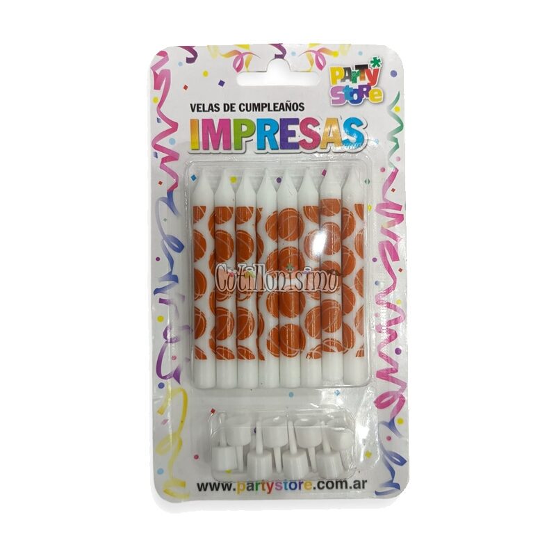 / Velas Impresas Blancas con Pelotas de Basket x8 Unidades