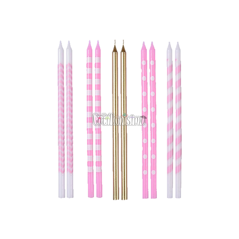 Velas Largas Impresas Rosa Lunares, Rayas y Doradas x10 Unidades