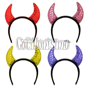 Detalles: Vincha de tela con los cuernitos forrados en lentejuelas a colores.