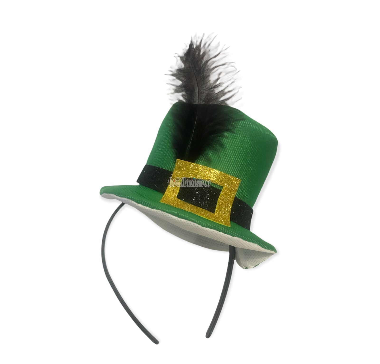 Vincha Galerita Verde con Pluma San Patricio Medidas Aproximadas de la Galera: 10cm de alto x 13cm de ancho