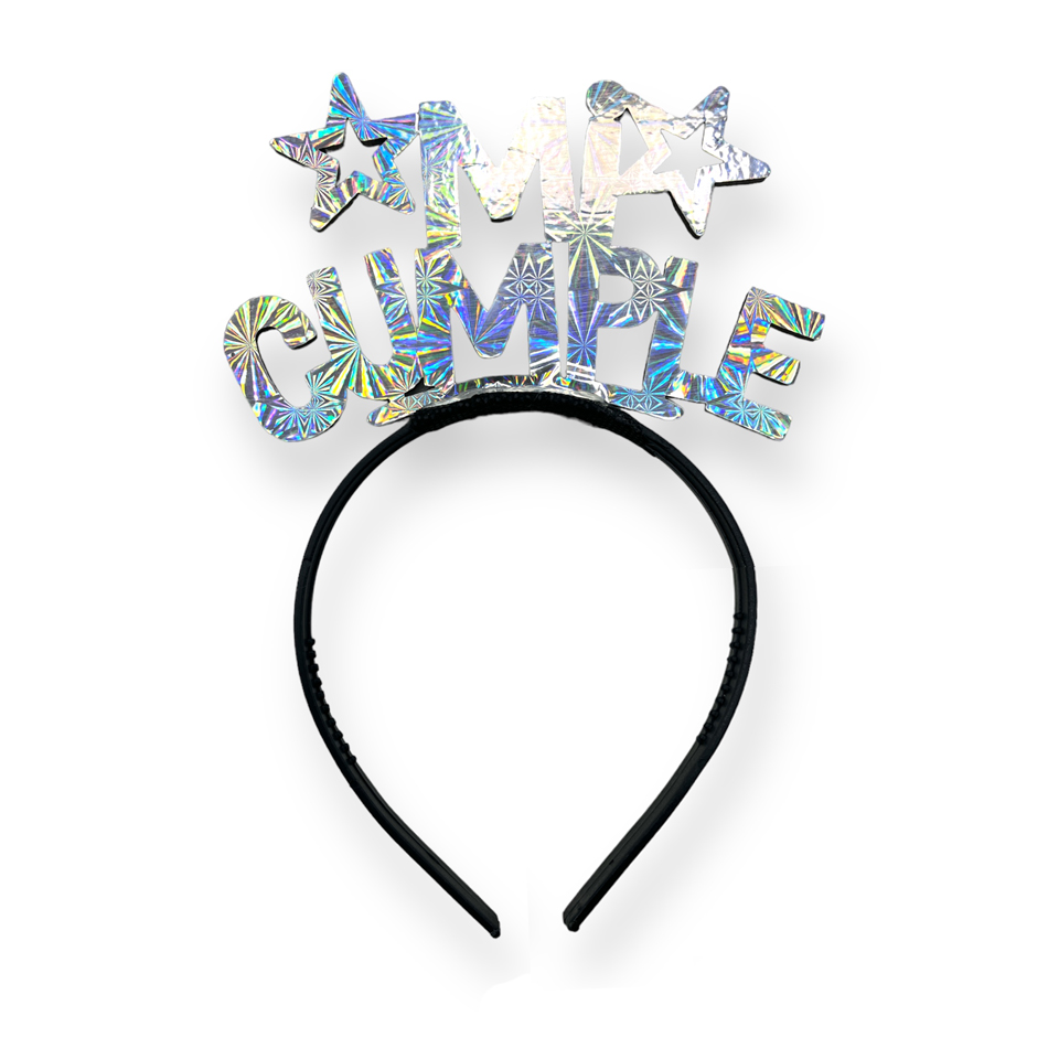 Vincha Goma Eva Mi Cumple Plata Holografico cantidad