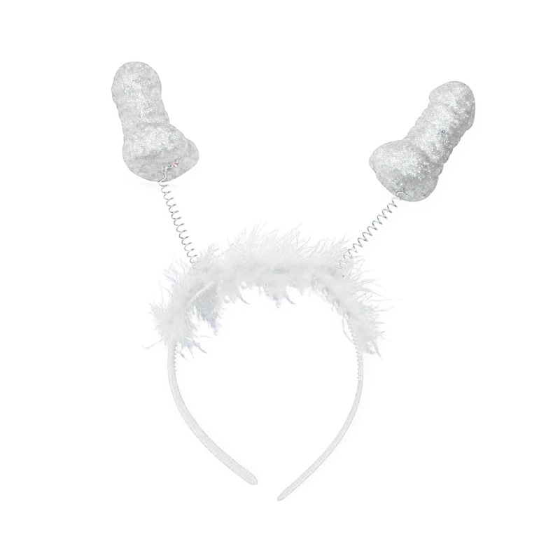 Vincha Resorte Penecitos – Penes Telgopor Brillo Glitter con Plumas Blancas x1 Unidad